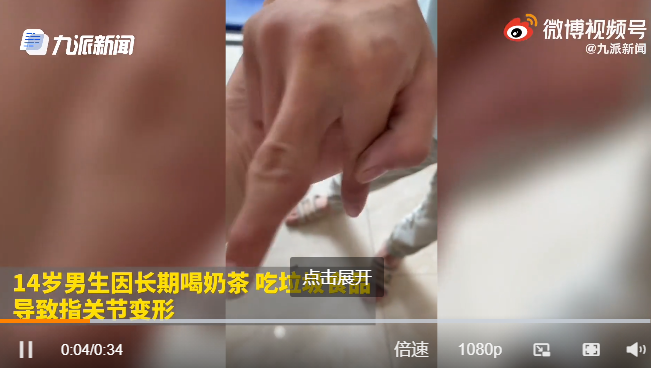 10月4日,重庆一14岁男生因长期喝奶茶吃垃圾食品导致关节变形,来到医院治疗手指。