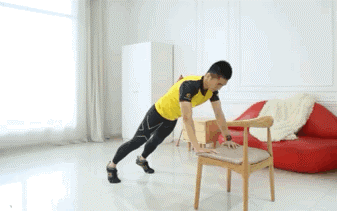 要点:直臂支撑在稳固的椅子或桌子边缘,注意收紧腰腹核心,臀部不要下榻,也不要拱起,从头到脚呈一直线;吸气时下降身体,呼气时胸肌和手臂发力撑起;每次撑起之后,左右手交替触摸肩部,然后再切换成侧展臂的练习;锻炼60秒,休息30秒,进入下一个练习