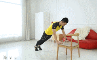要点:核心收紧,直臂支撑在稳固的椅子或桌子边缘,完成1次标准的俯卧撑后,双腿进行开合跳,循环往复交替进行上肢的俯卧撑和下肢的开合跳,注意,呼气时,胸肌发力推起身体,吸气时,下降胸部尽量接近椅子边缘。锻炼60秒,休息30秒,进入下一个练习