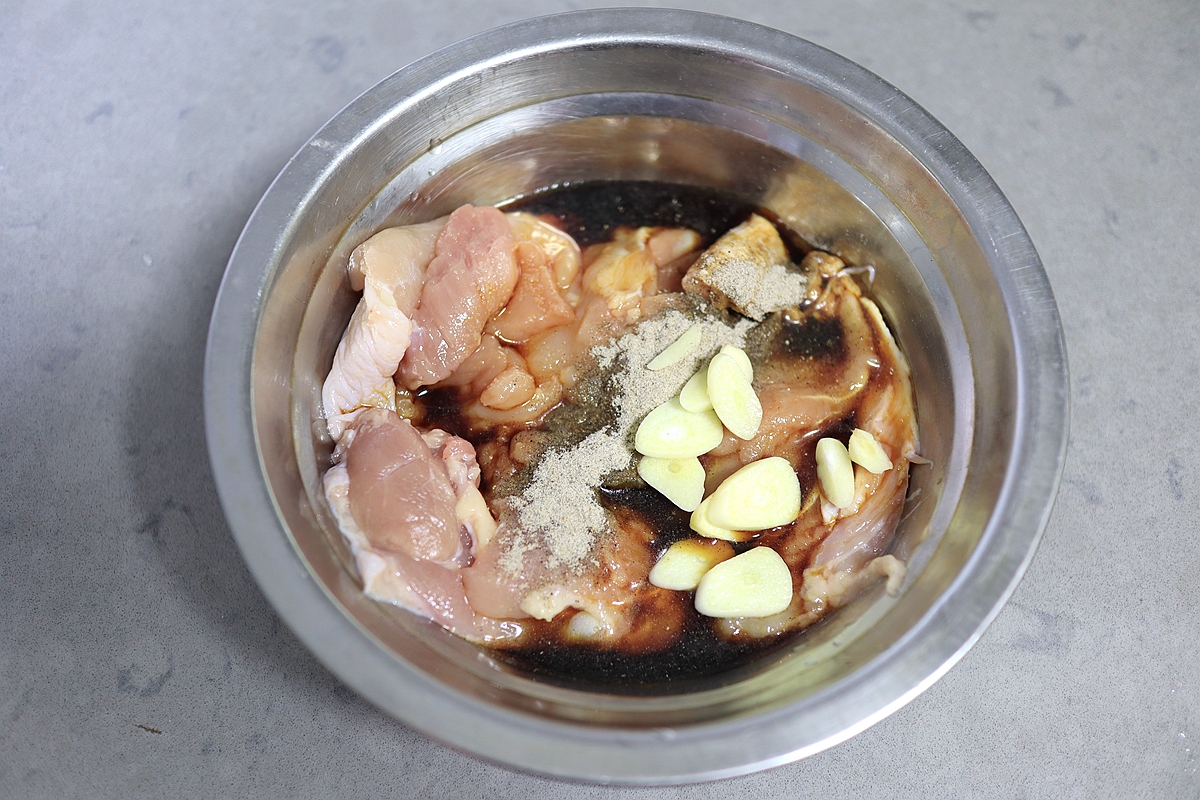 用工具将鸡大腿进行脱骨处理,把完整的鸡腿肉取下,剔除筋膜,放入碗中,随后往碗中加入6-8ml酱油、3-5ml料酒、2-3g黑胡椒粉、1g食盐、3-5瓣大蒜,用手抓匀,腌制30分钟以上。(时间宽裕的话,可以盖上保鲜膜,放入冰箱中,腌制3-4小时,再取出来进行烹饪)