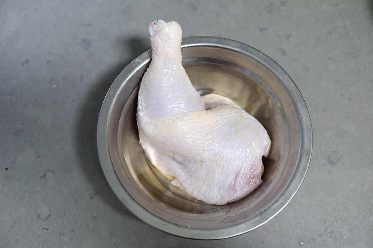把我们需要的鸡大腿、大蒜、食用油等食材和配料都准备好,先将鸡大腿冲洗干净放入小盆中。(别忘了把小盆刷干净了)