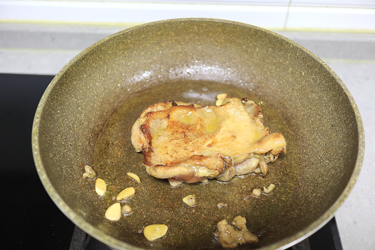 待到鸡腿肉腌制好后,往锅中倒入适量的植物油,大火烧热后,下入鸡腿肉,转中火煎炸至鸡皮收缩回去,然后翻面继续煎炸2-3分钟。