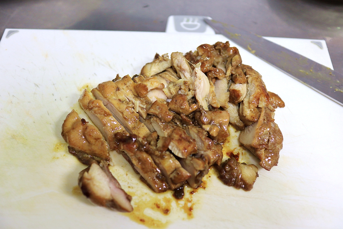 时间到后,往锅中倒入2-3ml酱油、20-30ml热水,盖上锅盖,转小火焖煮10-12分钟,待到汤汁变得浓稠后,将鸡肉取出切成小块。
