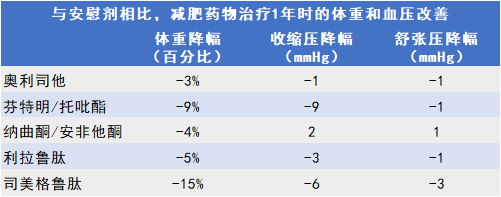 ▲与安慰剂相比,减肥药物治疗1年时的体重和血压改善(表格来源:参考资料[1];翻译整理:医学新视点)